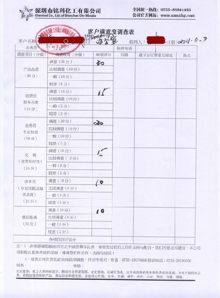 深圳市綿麗日用化工有限公司滿意度調查表