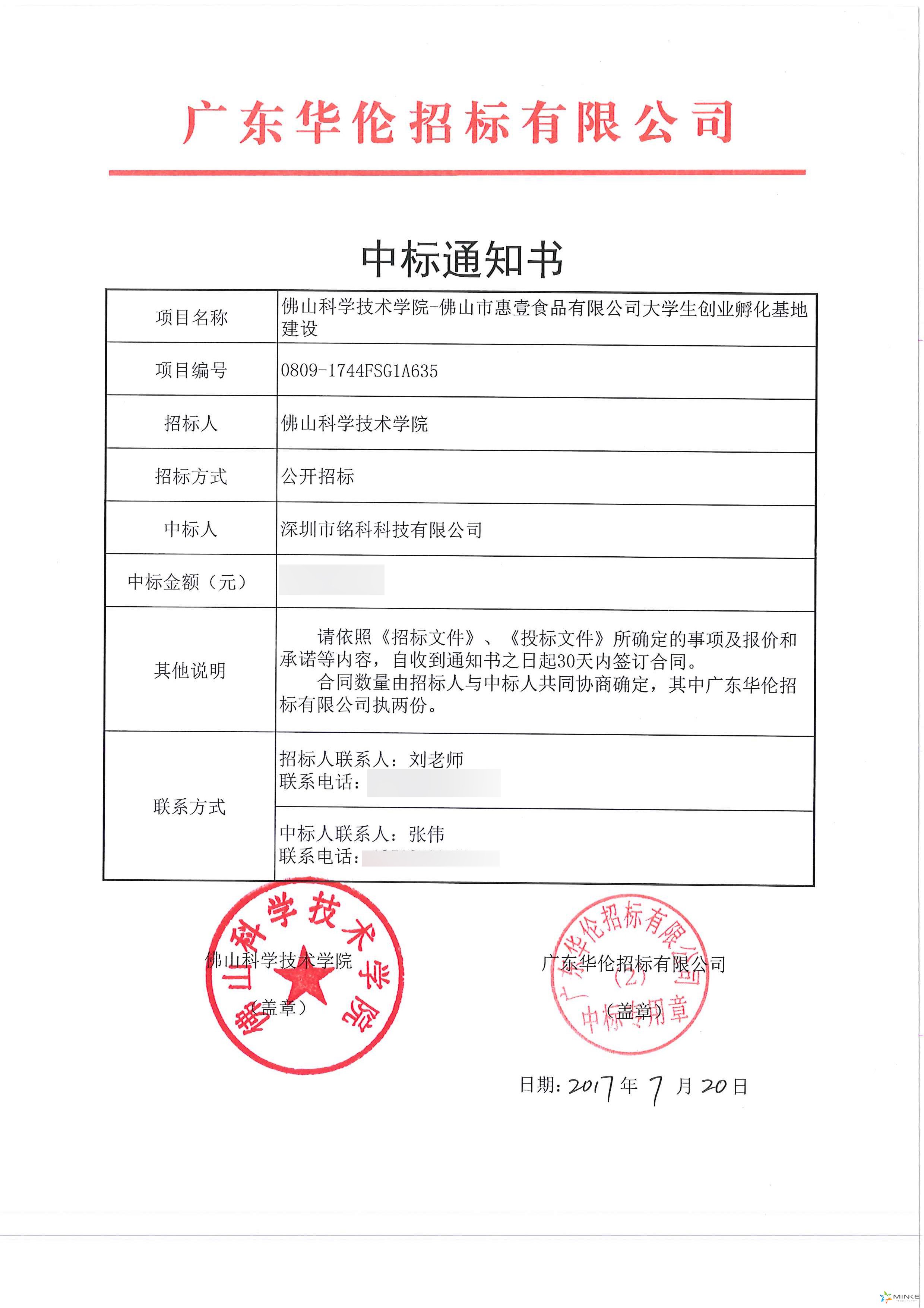 中標喜訊!我司在"佛山科學技術學院-佛山市惠壹食品有限公司大學生創業孵化基地建設“項目中 ,憑借過硬的產品品質、雄厚的技術實力、合理的價格、誠實守信的經營方式、卓越的運作團隊和良好的企業信譽,以絕對優勢順利中標!本次成功中標再次奠定了我公司良好的發展趨勢,也印證了公司的技術實力和客戶口碑,為今后工作的展開進一步開拓了市場,亦為今后的工作奠定了基礎。