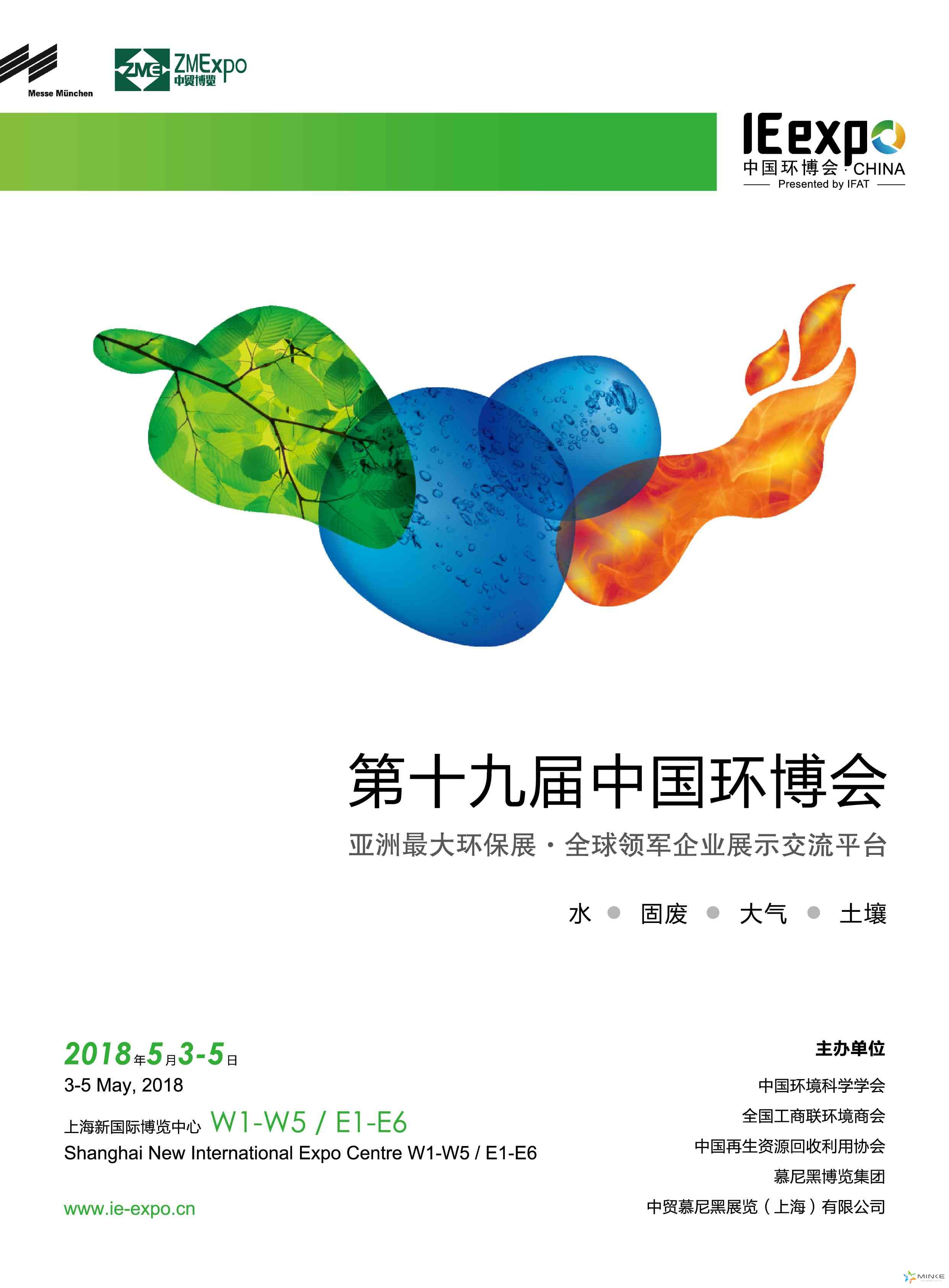 由中國環境科學學會、德國慕尼黑博覽集團、中貿慕尼黑展覽(上海)有限公司等單位聯袂舉辦的IE expo 2018第十九屆中國環博會將于2018年5月3-5日在上海新國際博覽中心舉行。